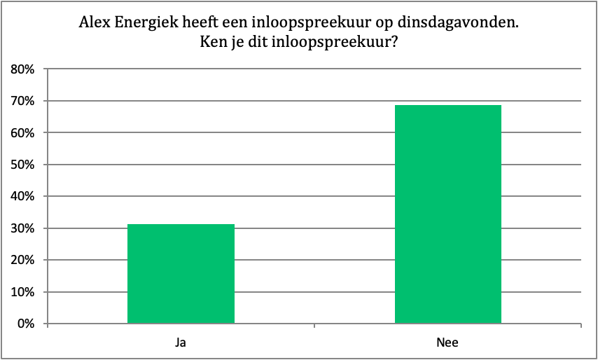3. 69% kent ons inloopspreekuur niet. Wij gaan aan de slag om meer bekendheid te geven aan ons inloopspreekuur. Vanaf maart 2026 is het inloopspreekuur op de tweede en vierde maandag van de maand. In maart is dat 9 en 23 maart. In april is dat 13 april (27 april vervalt vanwege Koningsdag). In februari is er nog iedere maand een inloopavond.